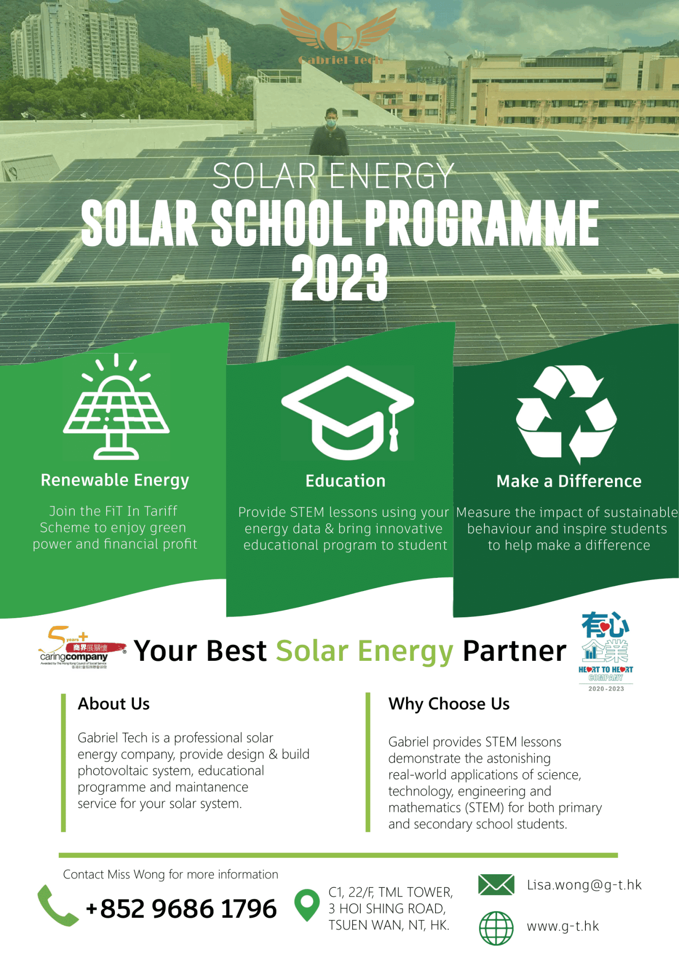 We provide Photovoltaic System design and build services, consultancy services and maintenance services for school, NGO, private sector and factory to join Feed In Tariff Scheme by CLP, HKE.